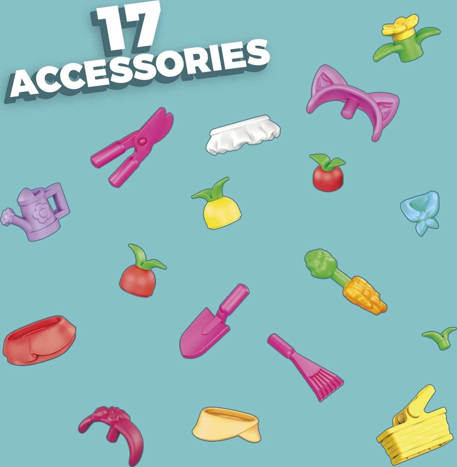 Play as you build the garden, bunny house, and vegetable stand which include roleplay accessories like vegetables, a cash register, and more