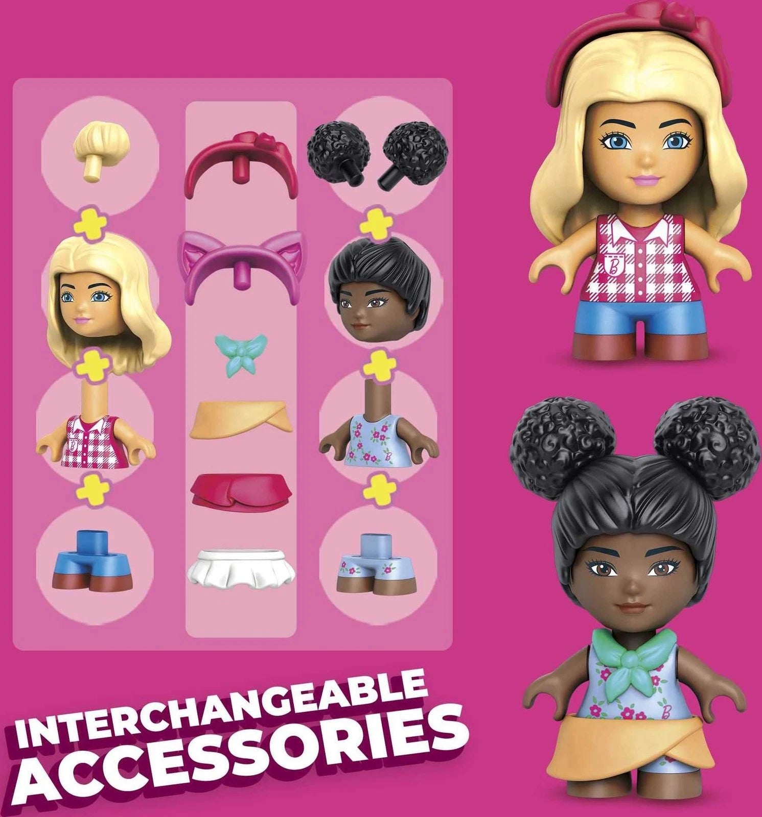 Building set comes with 3 Barbie micro-dolls, 4 animals, 80 building bricks including special pieces and accessories, and 3 heart-shaped baseplates to build on